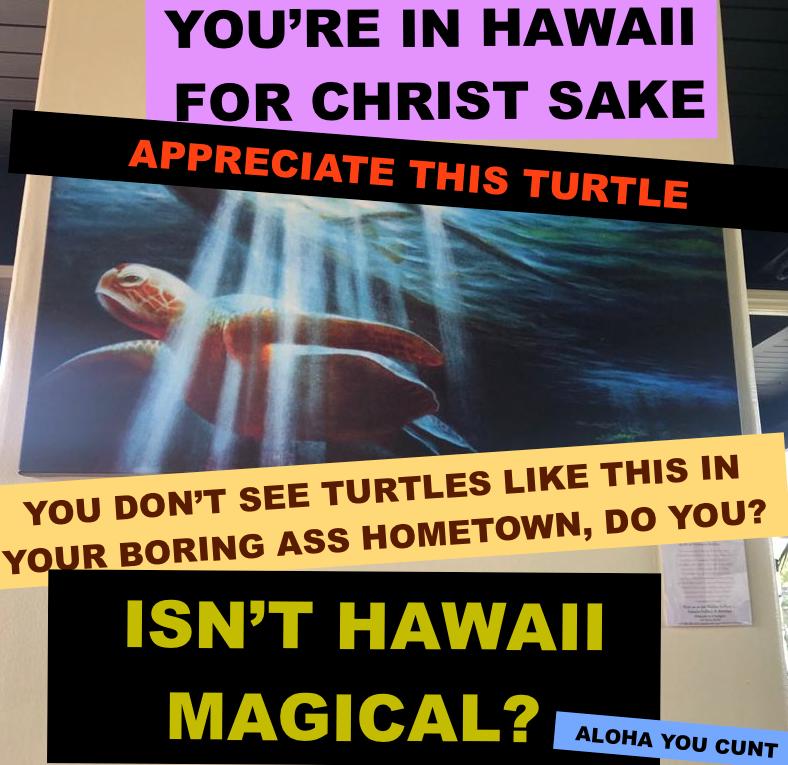 If they’re not boasting about about their own overblown island vacations, they’re trying to convince you that a visit to the Aloha State is some essential rite of passage. “You don’t want to end up shrivelled up, alone and regretful on your death bed that you never tried an island-grown, organic papaya, do you?” Or “At our last resort, you could pick organic papayas directly out of the waiter’s ass. Simply divine.“